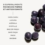 Poudre de baobab Bio* (57%), poudre de camu camu Bio* (9%), poudre de lucuma Bio* (9%), poudre d'acérola Bio* (9%), poudre de myrtille Bio* (4%), baie de maqui Bio* (4%), poudre de baie d'açaï Bio* (4%), poudre de maca Bio* (4%).