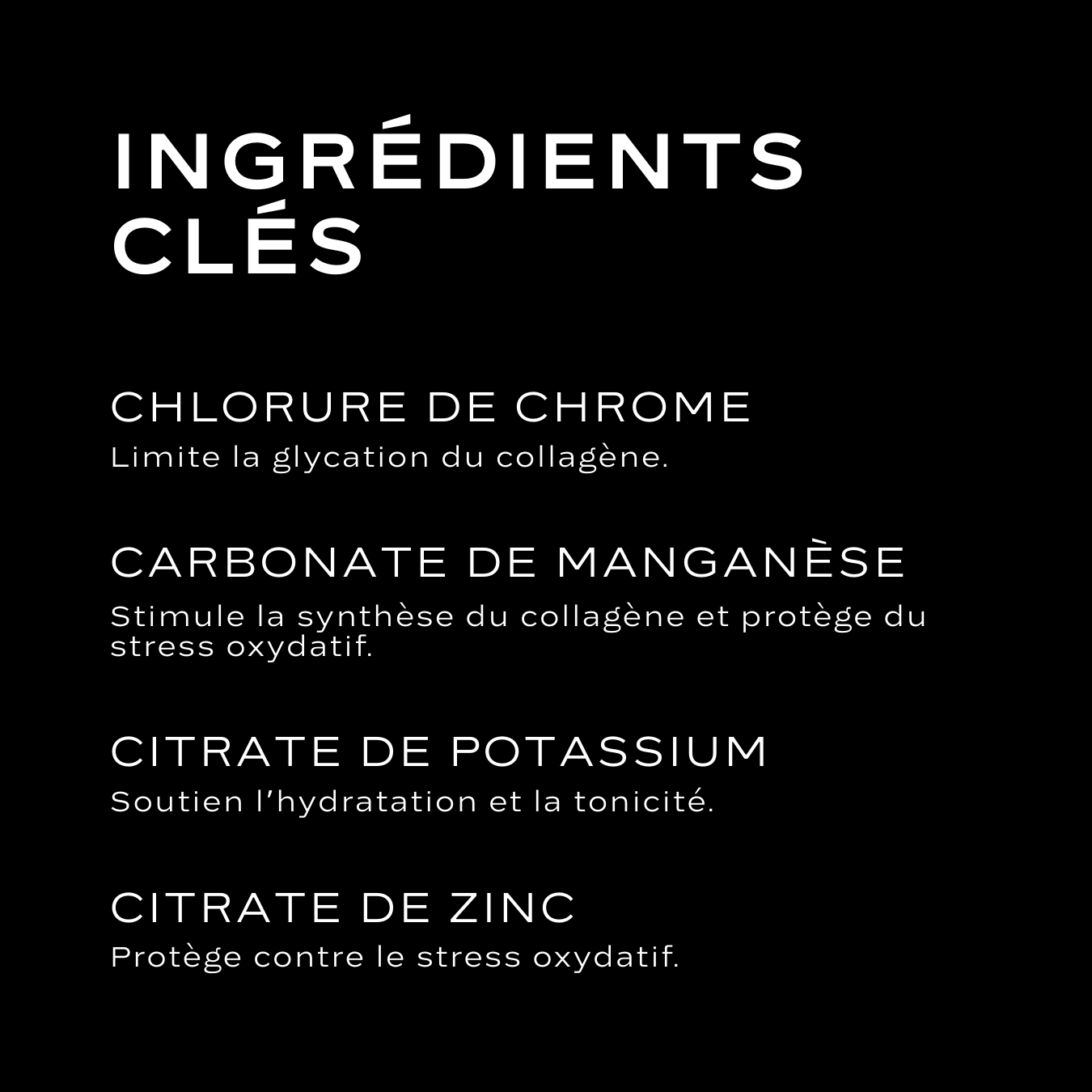 Citrate de potassium, citrate de zinc, chlorure de chrome, carbonate de zinc, carbonate de manganèse.