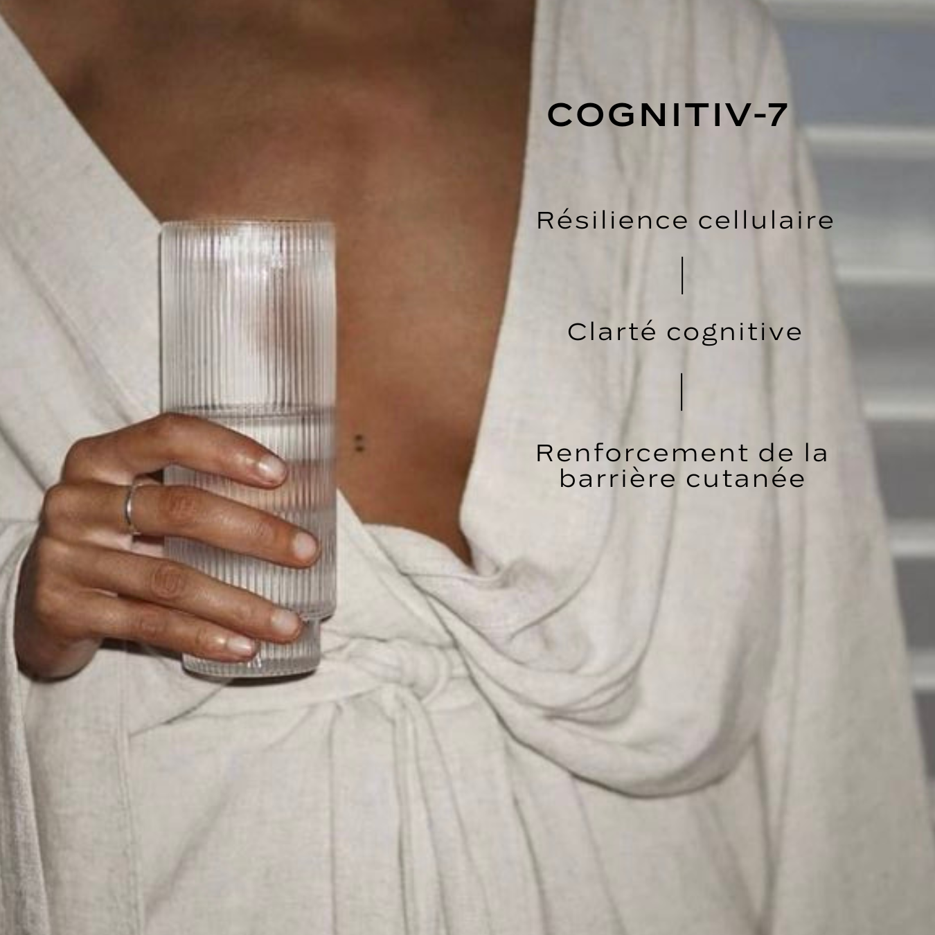 Cognitiv-7 est une synergie de 7 actifs neuro-nutritionnels et adaptogènes, conçus pour restaurer l’équilibre émotionnel et soutenir vos fonctions cognitives. En réduisant l’impact du stress oxydatif et hormonal sur vos cellules, il favorise la longévité cutanée.
