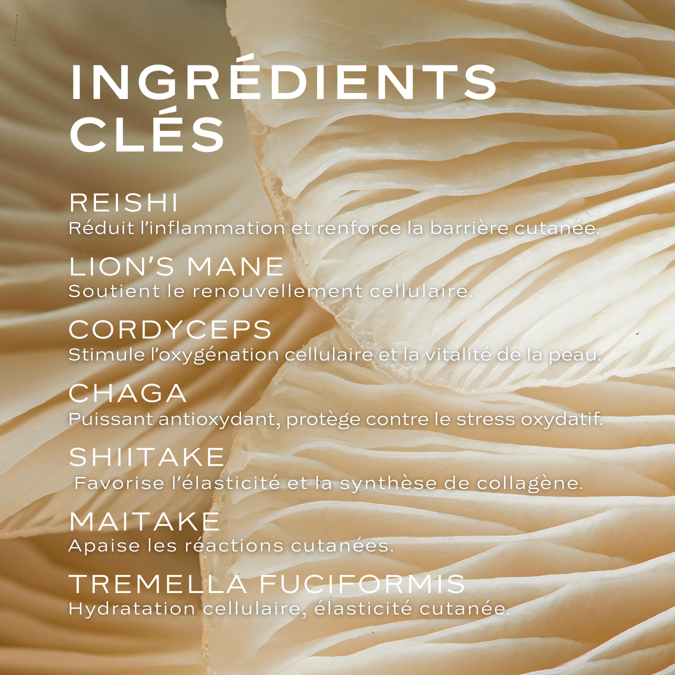 Reishi*, Cordyceps*, Lion’s Mane*, Chaga*, Shiitake*, Maïtake*, Tremella fuciformis*.