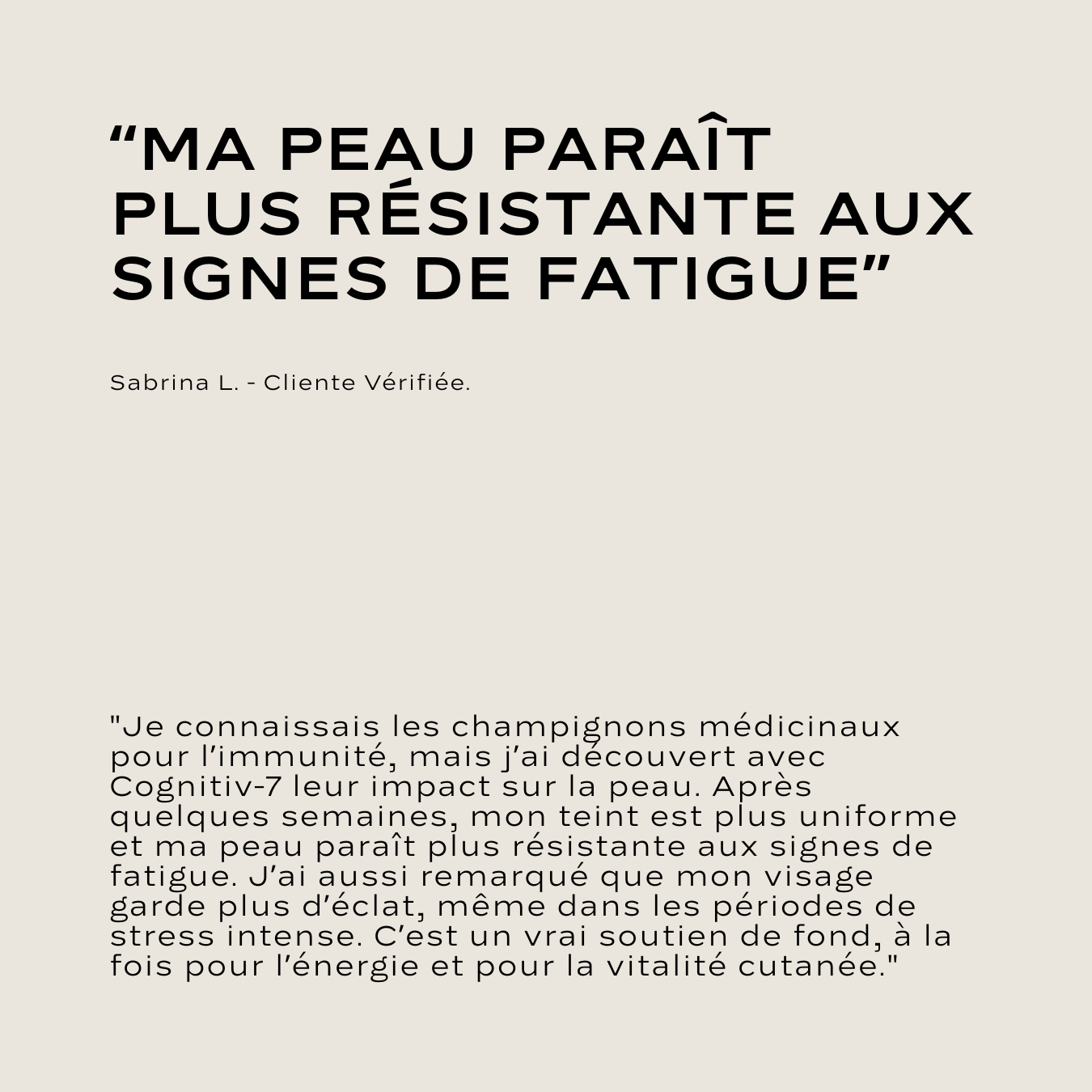 "Je traversais une période de stress intense, avec la peau qui en portait les marques : teint terne, tiraillements, petites poussées d’imperfections. Après quelques semaines avec Cognitiv-7, j’ai remarqué une vraie différence : je dors mieux, je gère plus sereinement mes journées et ma peau paraît plus apaisée. C’est devenu un rituel qui agit autant sur mon esprit que sur mon visage."