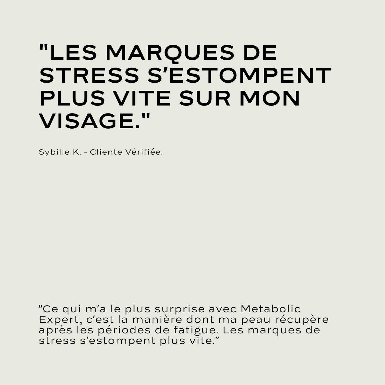 Metabolic Expert ne remplace pas les soins topiques, mais agit au niveau cellulaire pour renforcer leur efficacité. C’est une approche “in & out” : protéger et réparer de l’intérieur pour optimiser les résultats à l’extérieur.